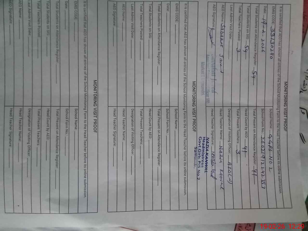 | Certified that this School was Inspected by the Undersigned MEA/DMO Today and the Information Stated Above is as Per Record. | |||||