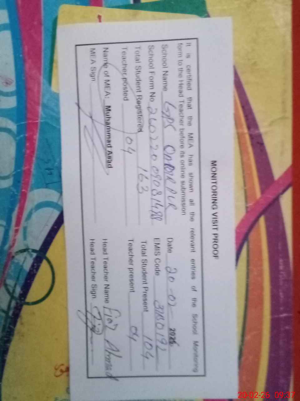 | Attendance Register | Head Teacher | MEA with School | Visit Proof |