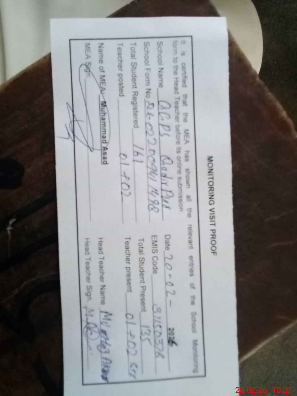 | Attendance Register | Head Teacher | MEA with School | Visit Proof |