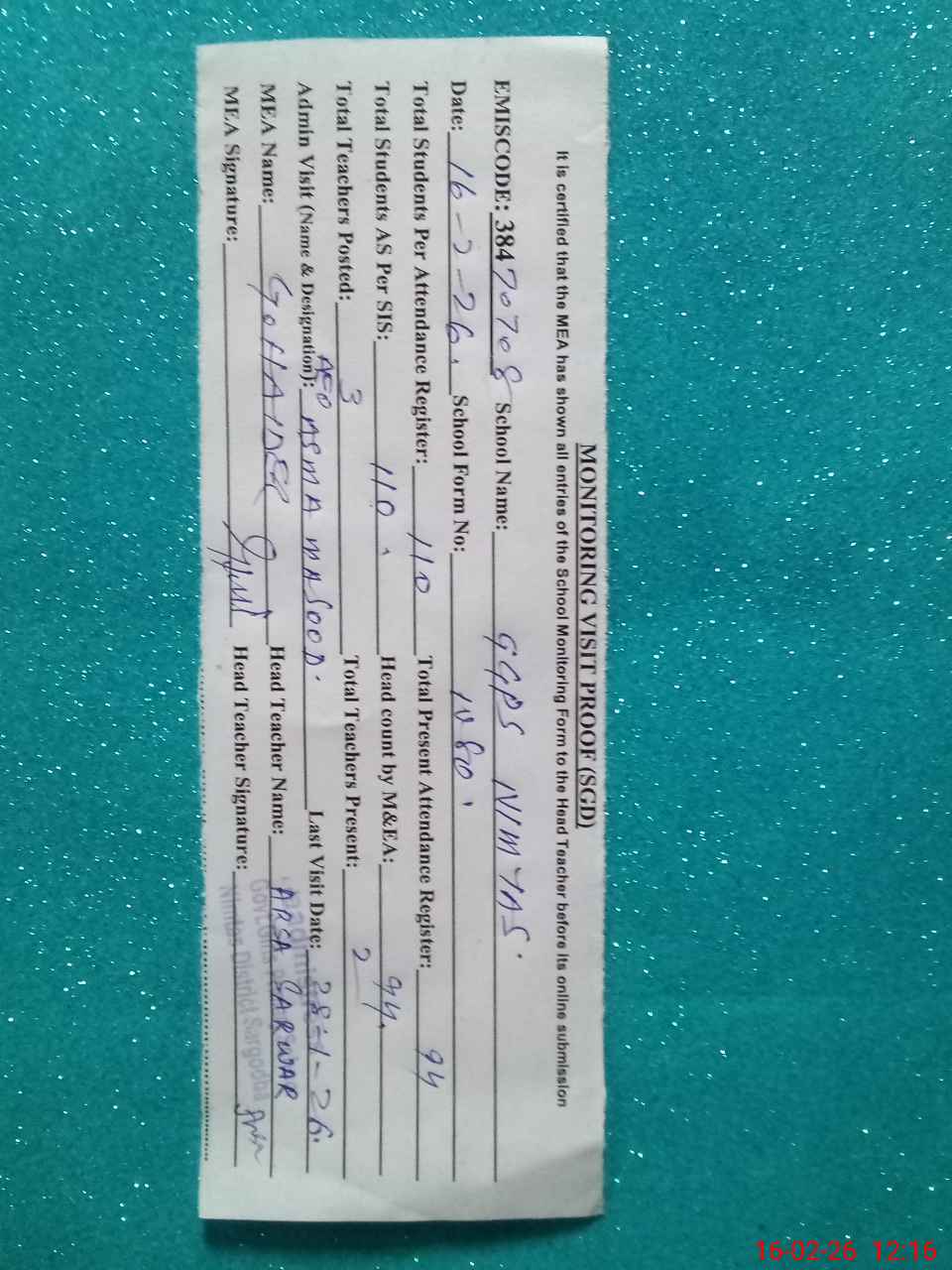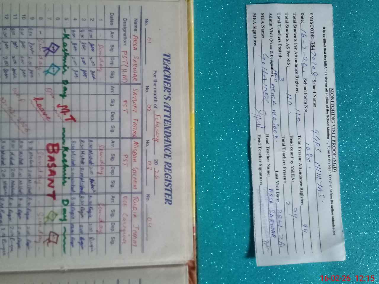 | Attendance Register | Head Teacher | MEA with School | Visit Proof |