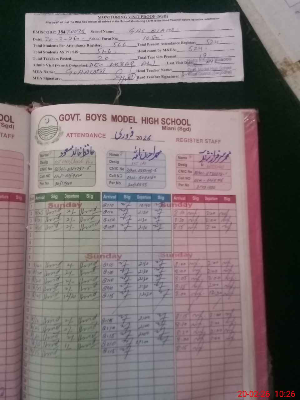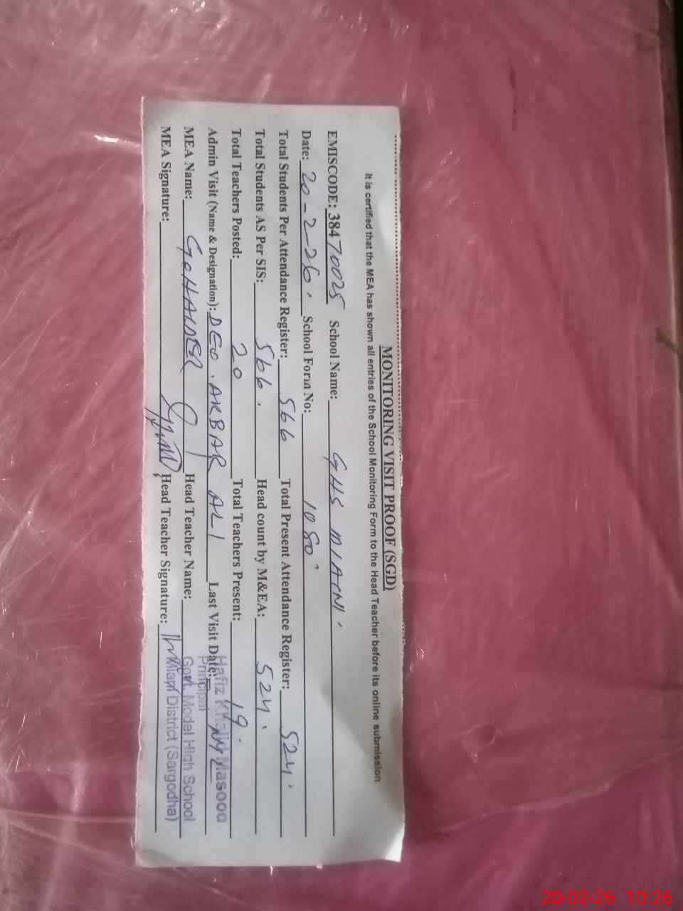 | Monitoring Date: 20-02-2026 | Start Time: 20-02-2026 09:33 AM | End Time: 20-02-2026 10:29 AM | Name of MEA: GH**** HA**** | |