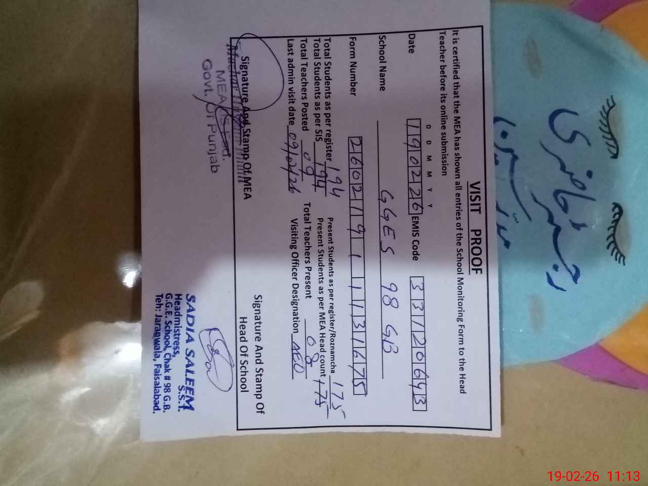 | EMIS Code: 33120643 | Name of School: GGES CHAK NO 98 GB | |||