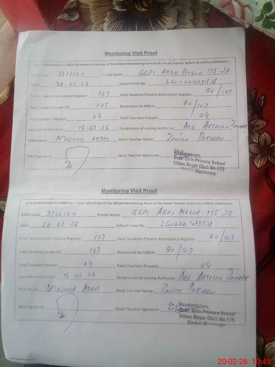 | EMIS Code: 33221211 | Name of School: GGPS CHAK NO 175 JB ABAS NAGAR | |||
