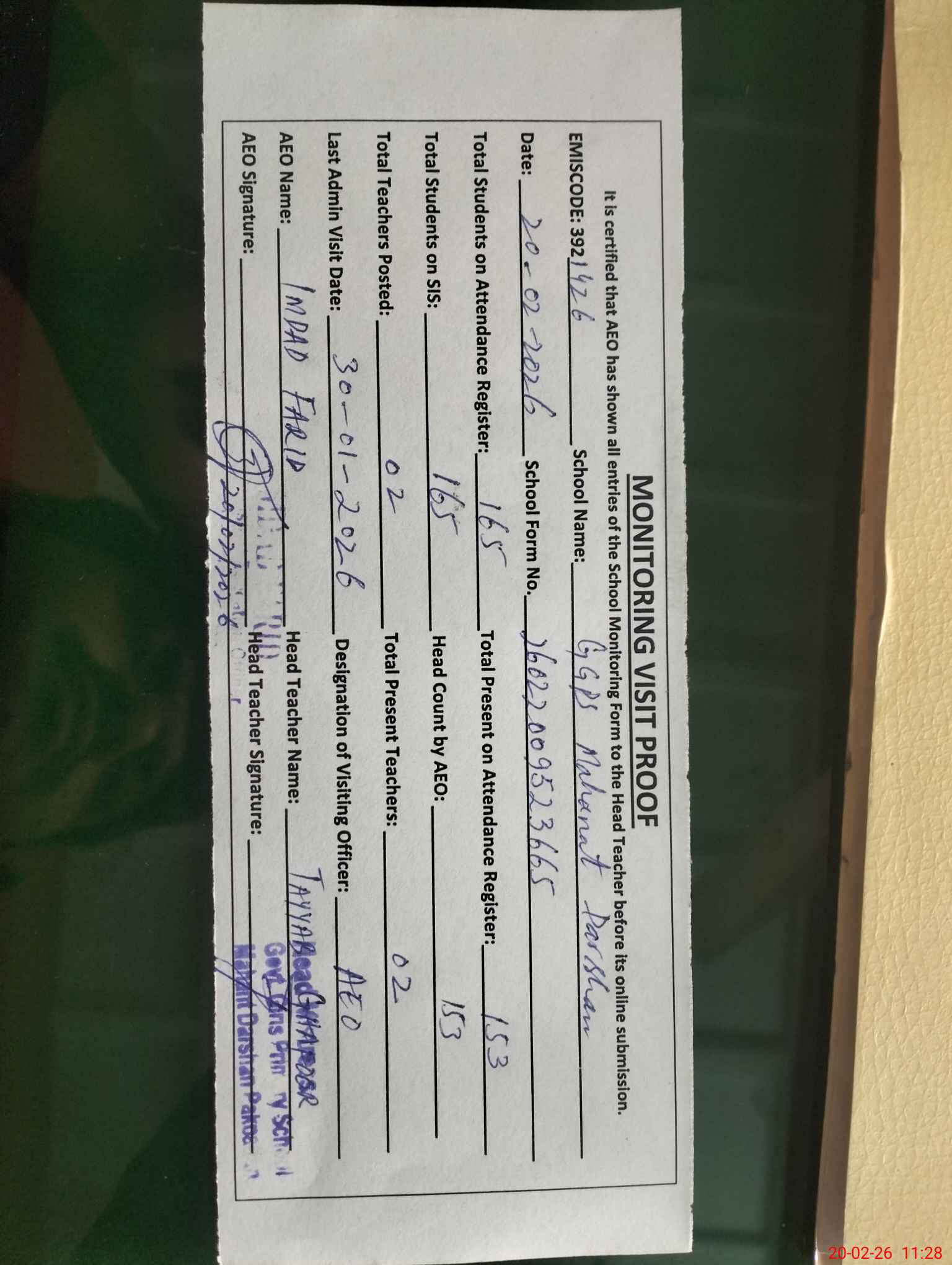 | Attendance Register | Head Teacher | MEA with School | Visit Proof |