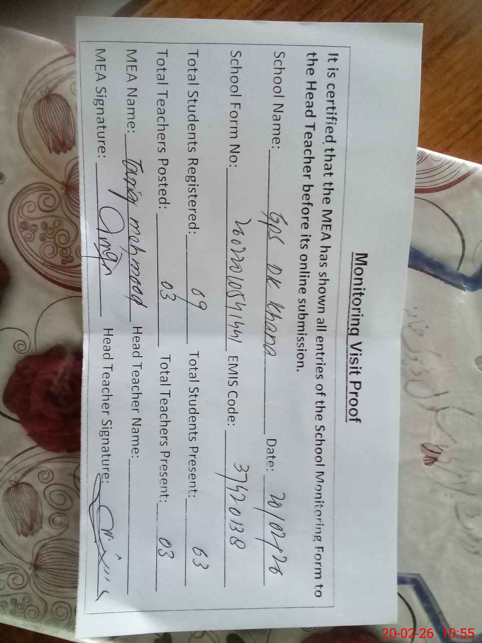 | Attendance Register | Head Teacher | MEA with School | Visit Proof |