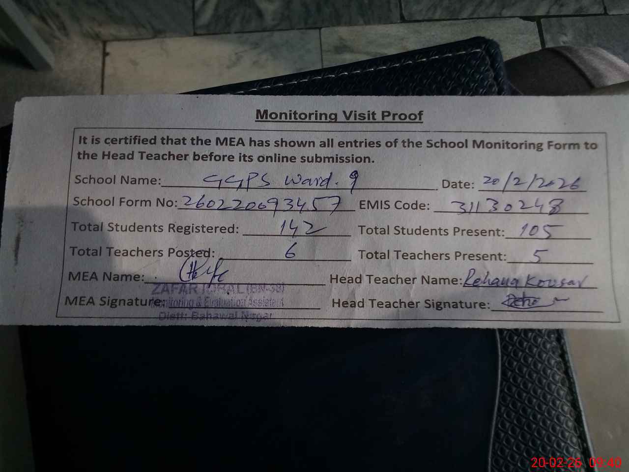 | Monitoring Date: 20-02-2026 | Start Time: 20-02-2026 09:20 AM | End Time: 20-02-2026 09:41 AM | Name of MEA: Za**** Iq**** BN**** | |