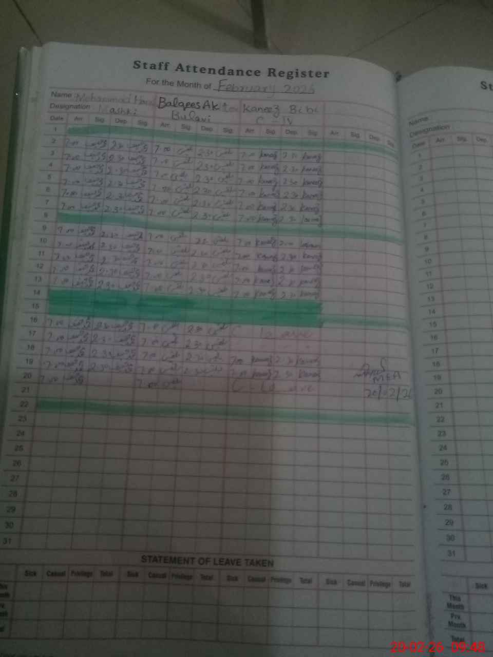 | Monitoring Date: 20-02-2026 | Start Time: 20-02-2026 09:31 AM | End Time: 20-02-2026 10:22 AM | Name of MEA: Mu**** Ay**** | |