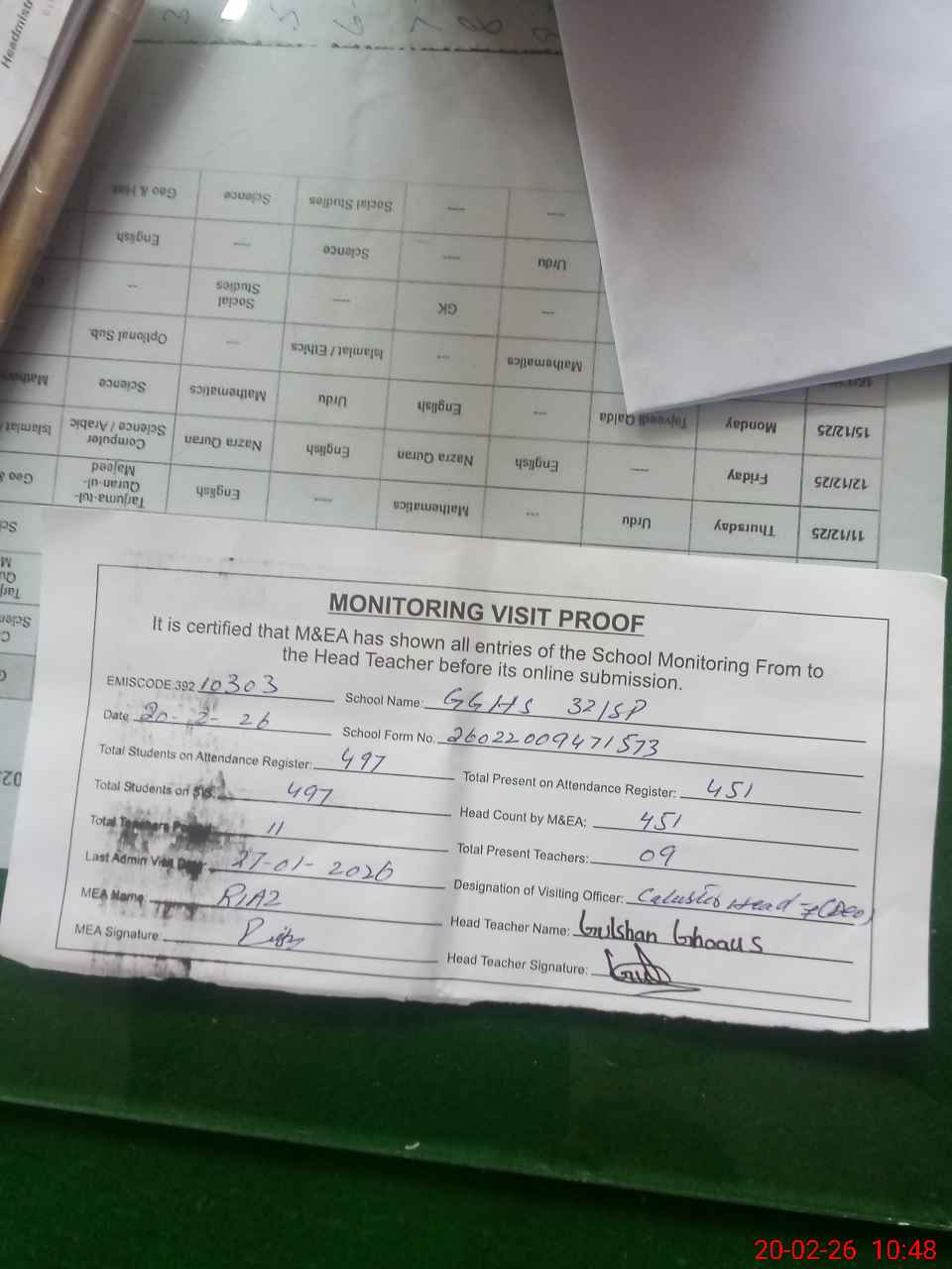 | EMIS Code: 39210303 | Name of School: GGHS CHAK NO.32 SP TABAR | |||