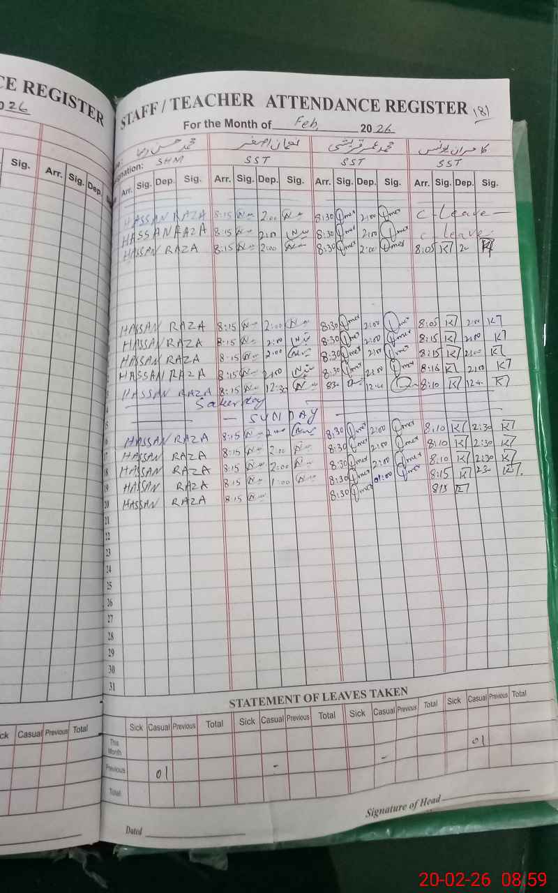 | CNIC | Full Name | Designation | R/C | Absence During Last Calender Month |