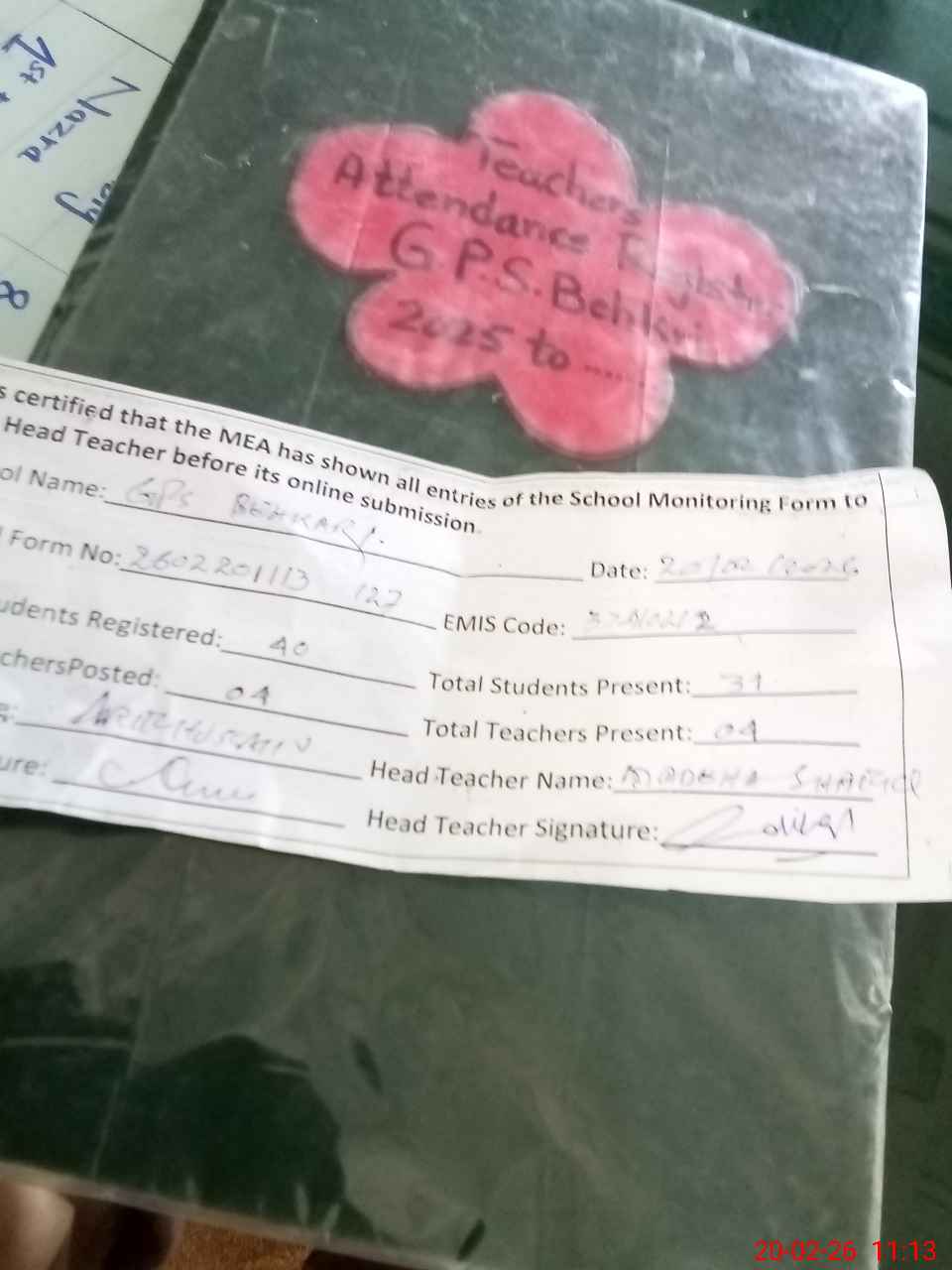 | Attendance Register | Head Teacher | MEA with School | Visit Proof |