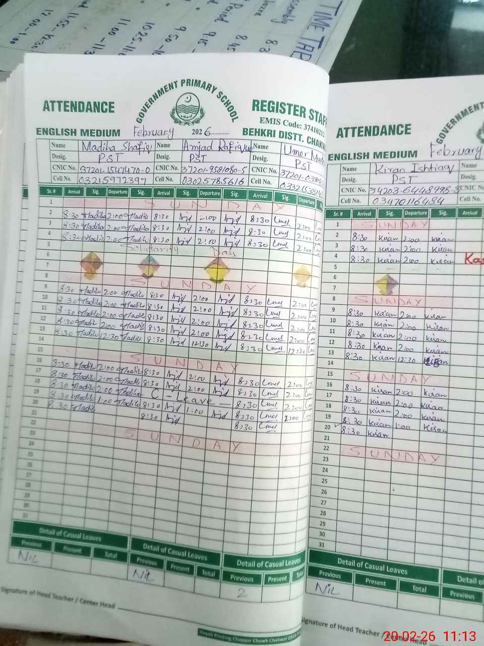 | CNIC | Full Name | Designation | R/C | Absence During Last Calender Month |
