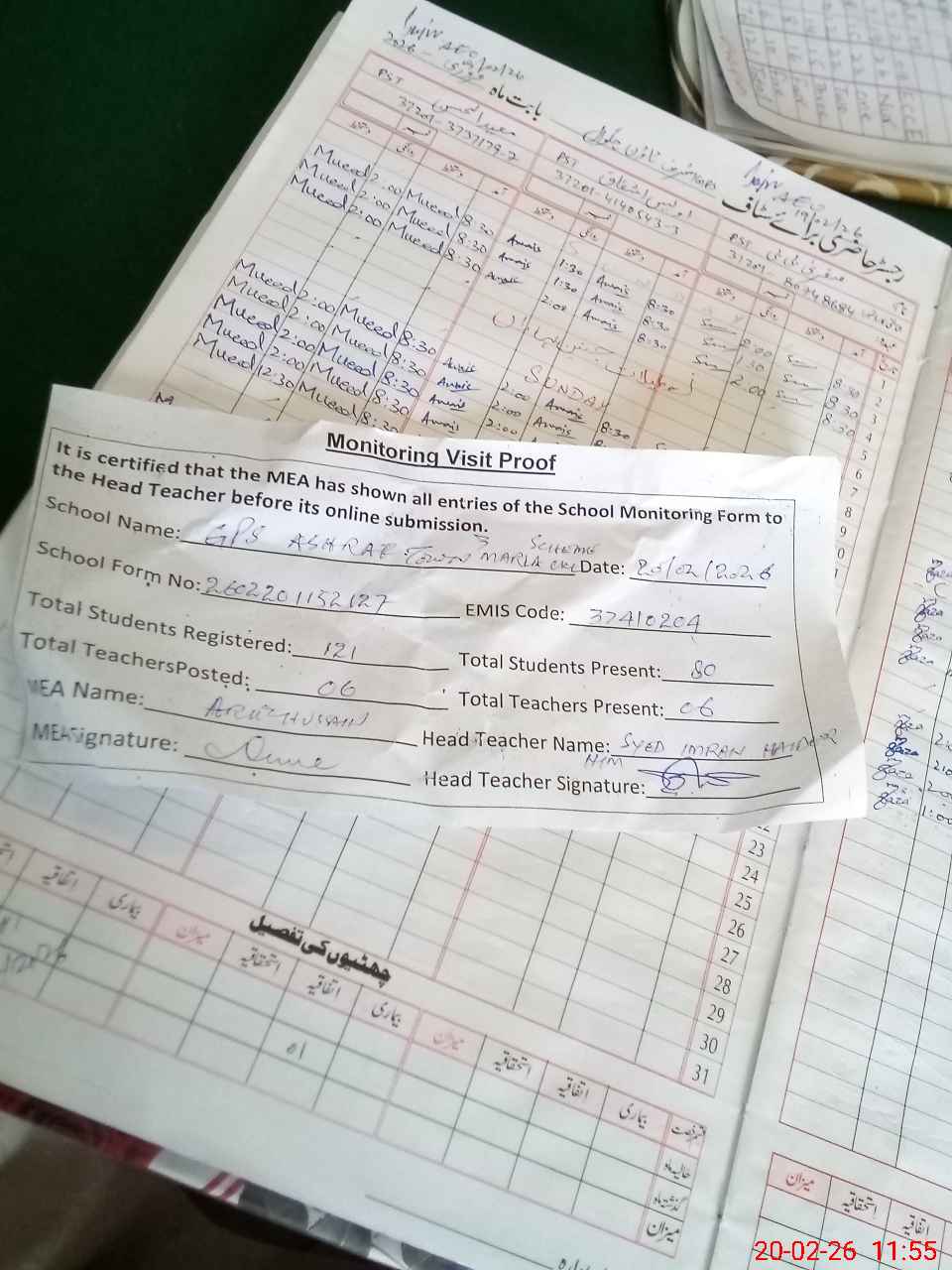 | Attendance Register | Head Teacher | MEA with School | Visit Proof |