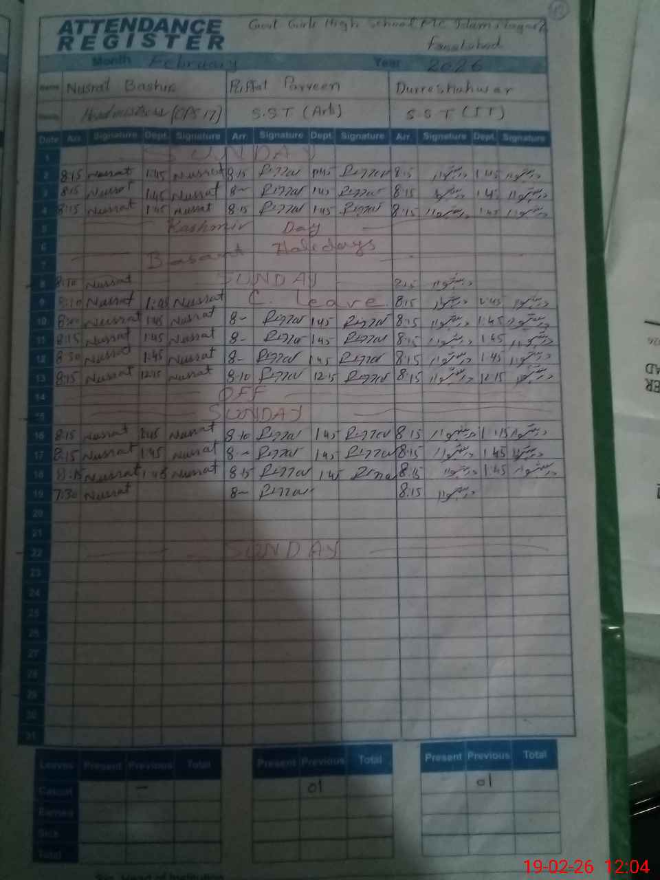| Leave | Duty | Absent | Maternity | Medical | Ex- Pak |