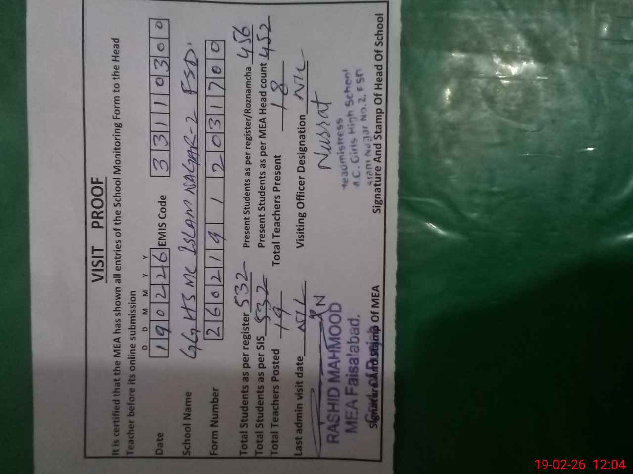 | EMIS Code: 33110300 | Name of School: GGHS MC ISLAM NAGAR 2 FSD | |||