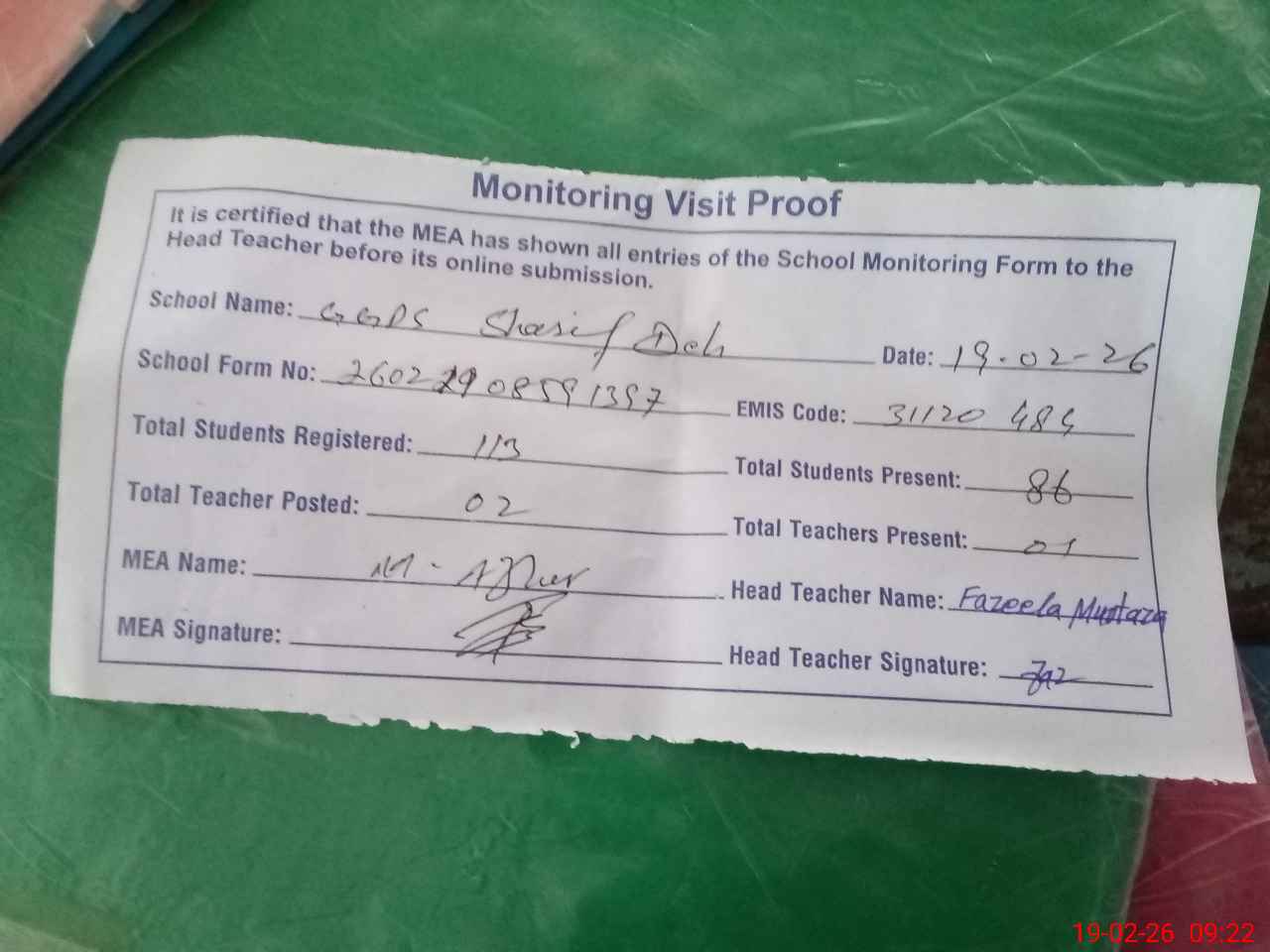 | Attendance Register | Head Teacher | MEA with School | Visit Proof |
