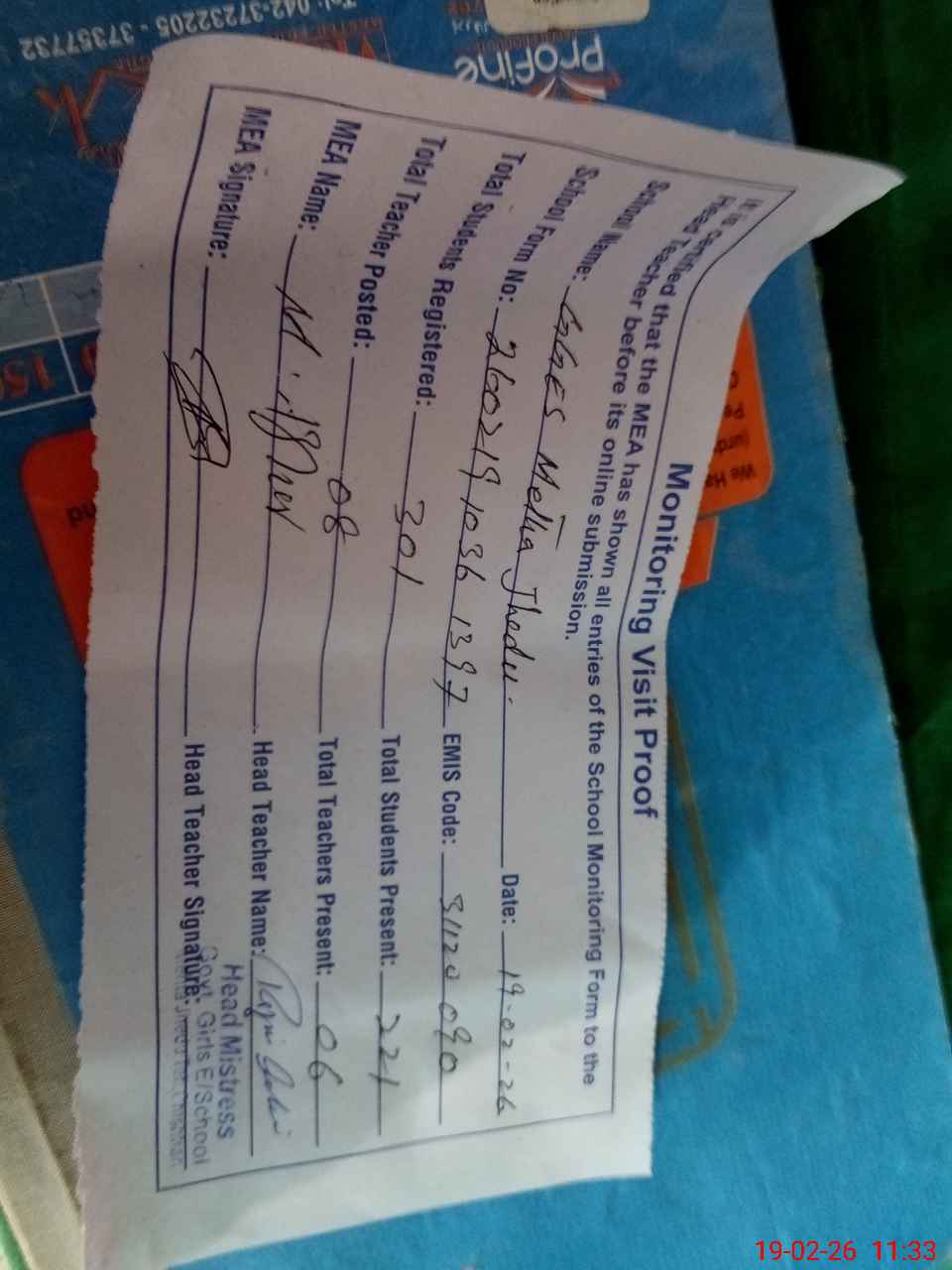 | Attendance Register | Head Teacher | MEA with School | Visit Proof |