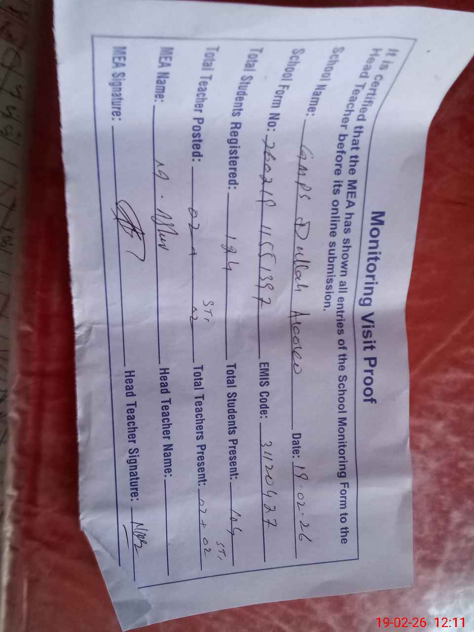 | Attendance Register | Head Teacher | MEA with School | Visit Proof |