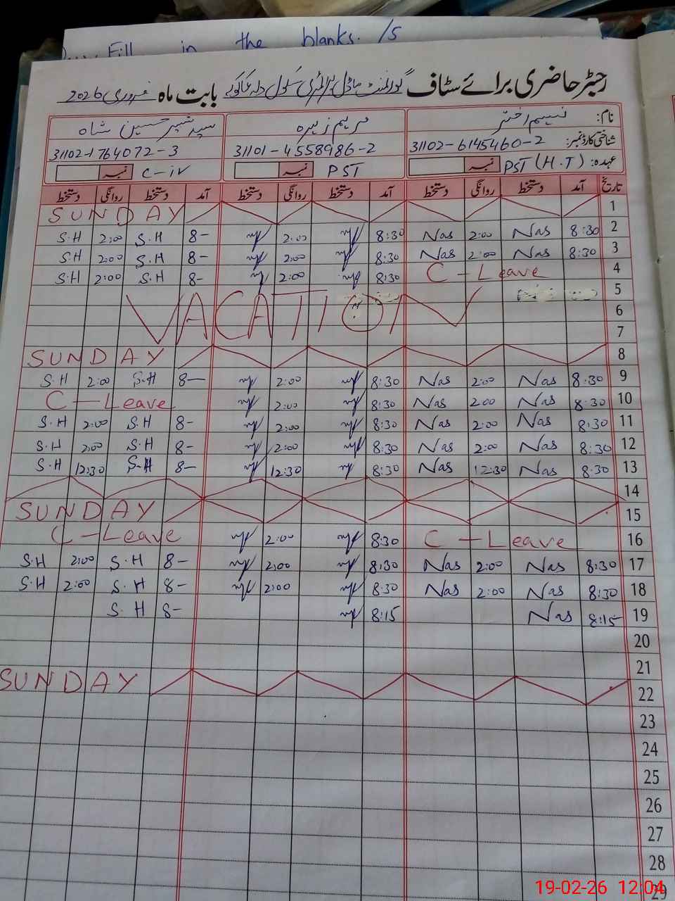 | CNIC | Full Name | Designation | R/C | Absence During Last Calender Month |