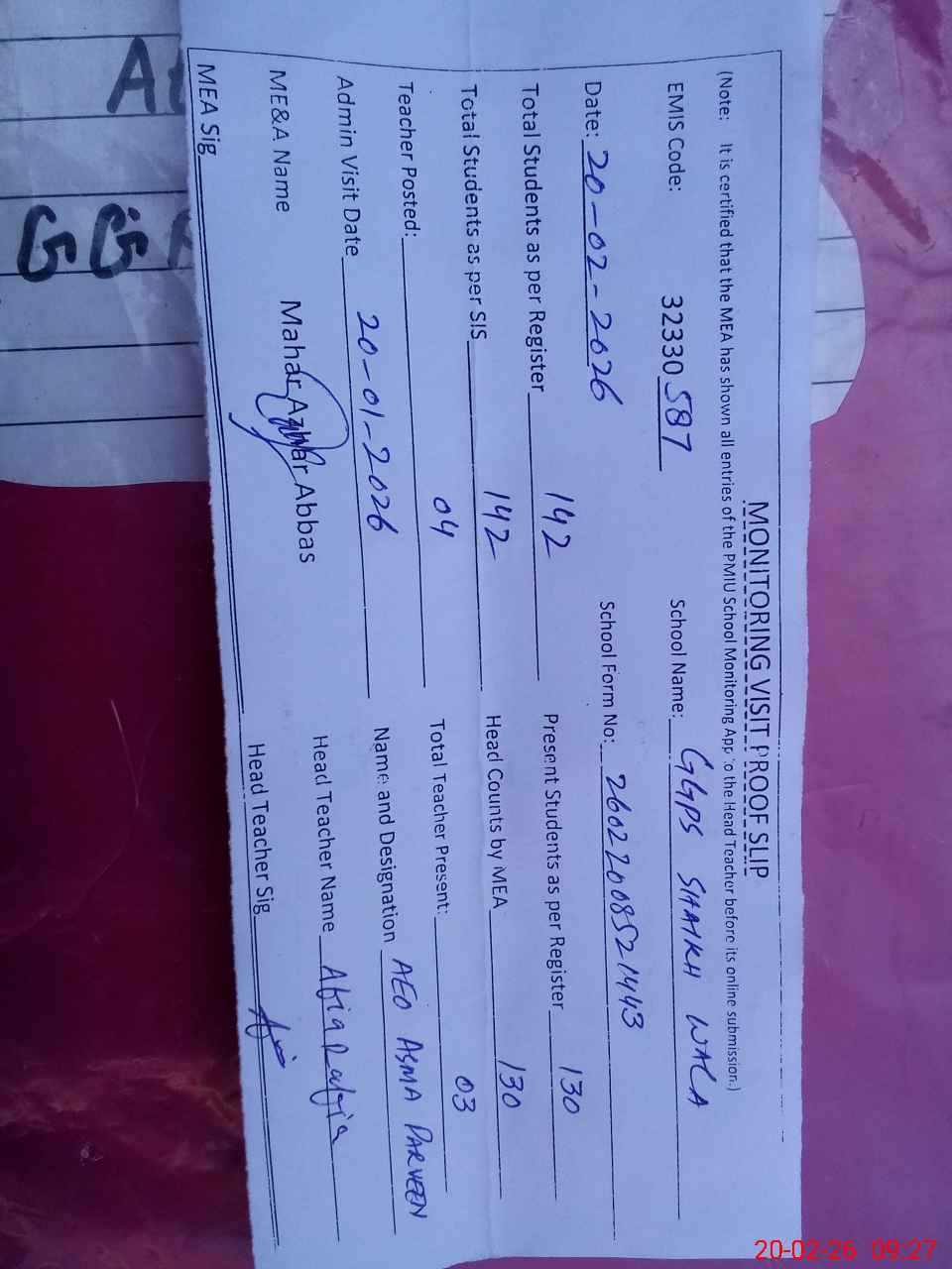| Attendance Register | Head Teacher | MEA with School | Visit Proof |