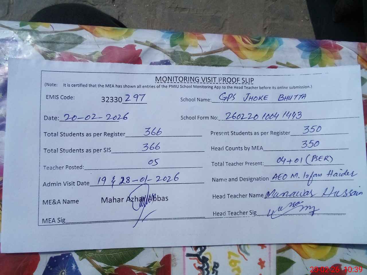 | EMIS Code: 32330297 | Name of School: GPS JHOKE BHUTTA | |||