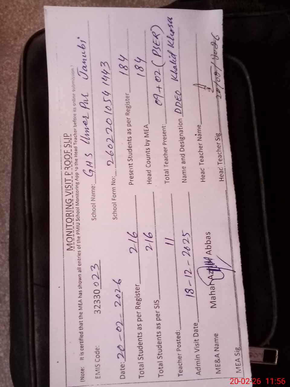 | Attendance Register | Head Teacher | MEA with School | Visit Proof |
