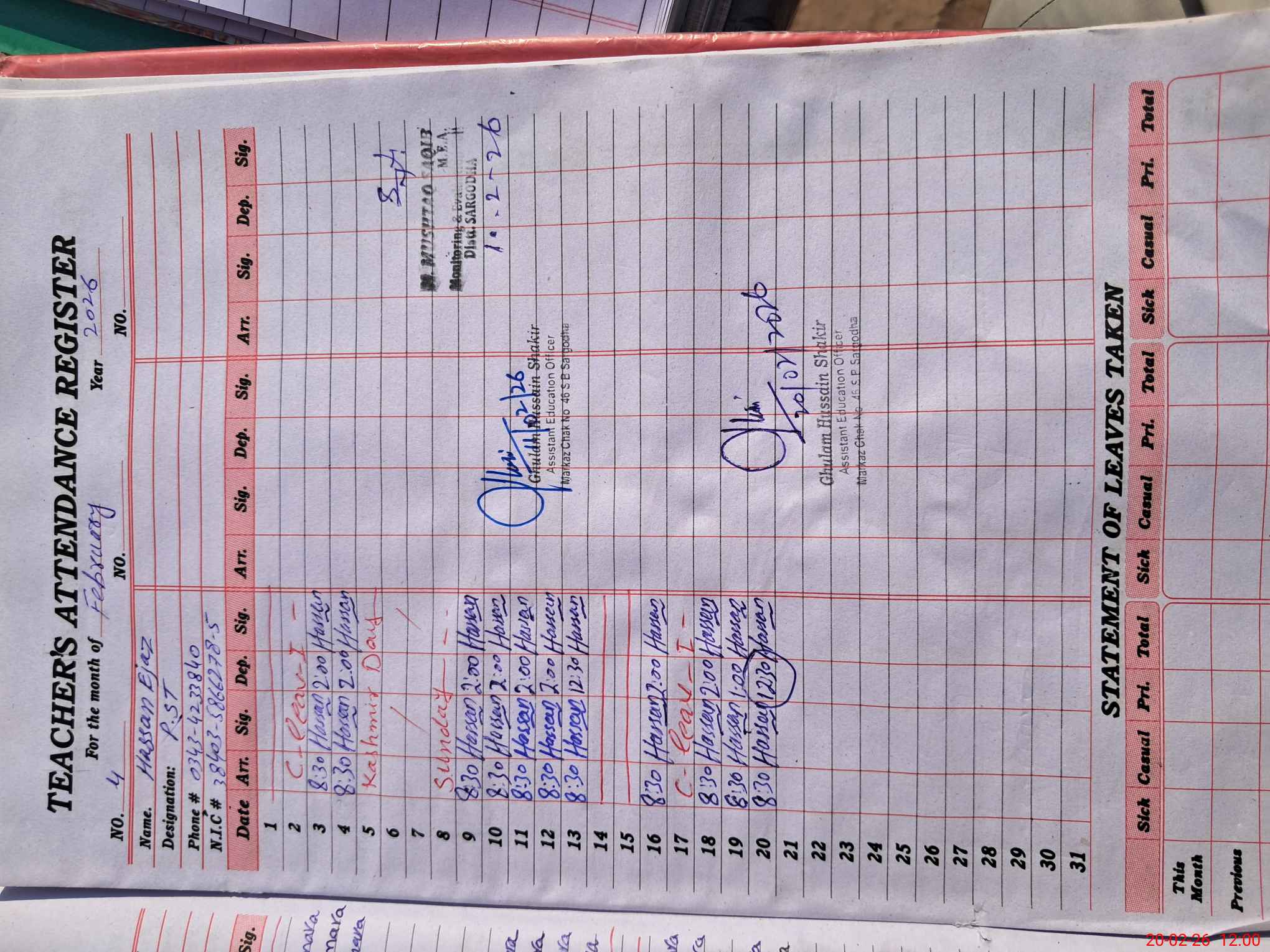 | Name: NA**** UL**** Designation: (School Headmaster's/Headmistress's) PTC/JV Phone/Cell Number: 03**** |