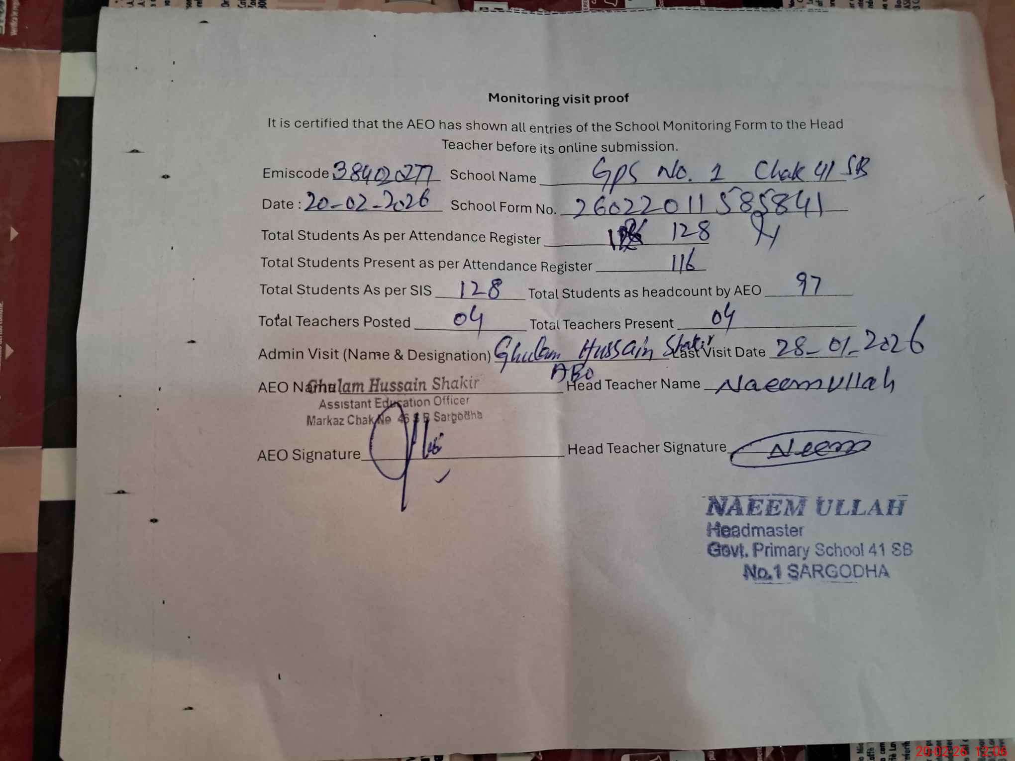 | Attendance Register | Head Teacher | MEA with School | Visit Proof |