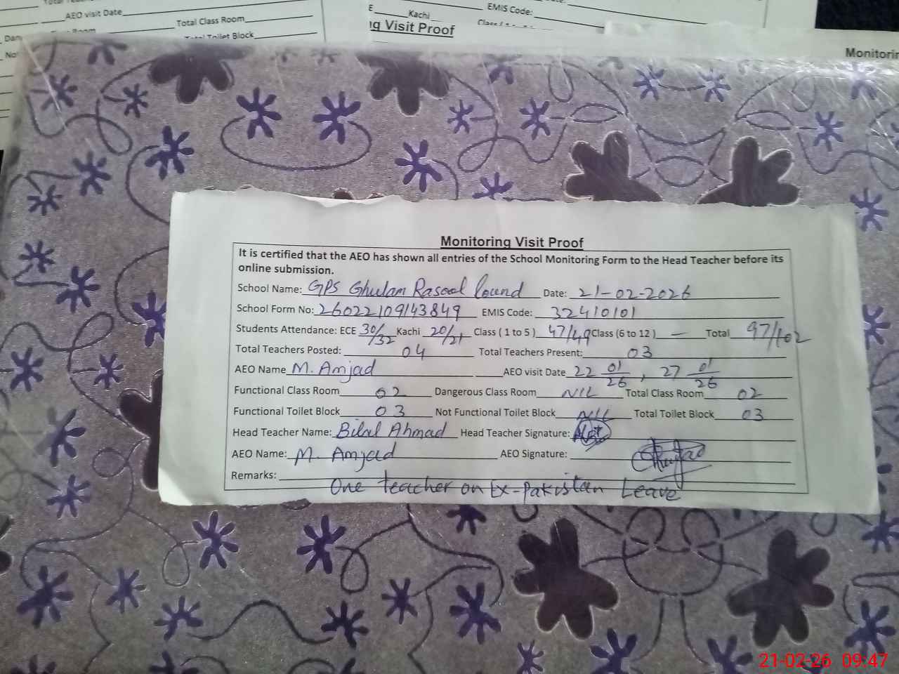 | EMIS Code: 32410101 | Name of School: GPS GHULAM RASOOL LUND | |||
