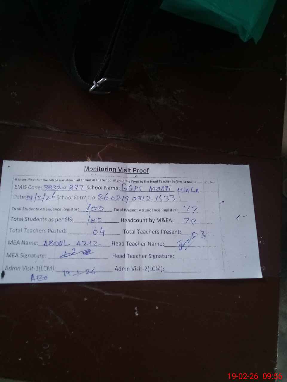 | Attendance Register | Head Teacher | MEA with School | Visit Proof |