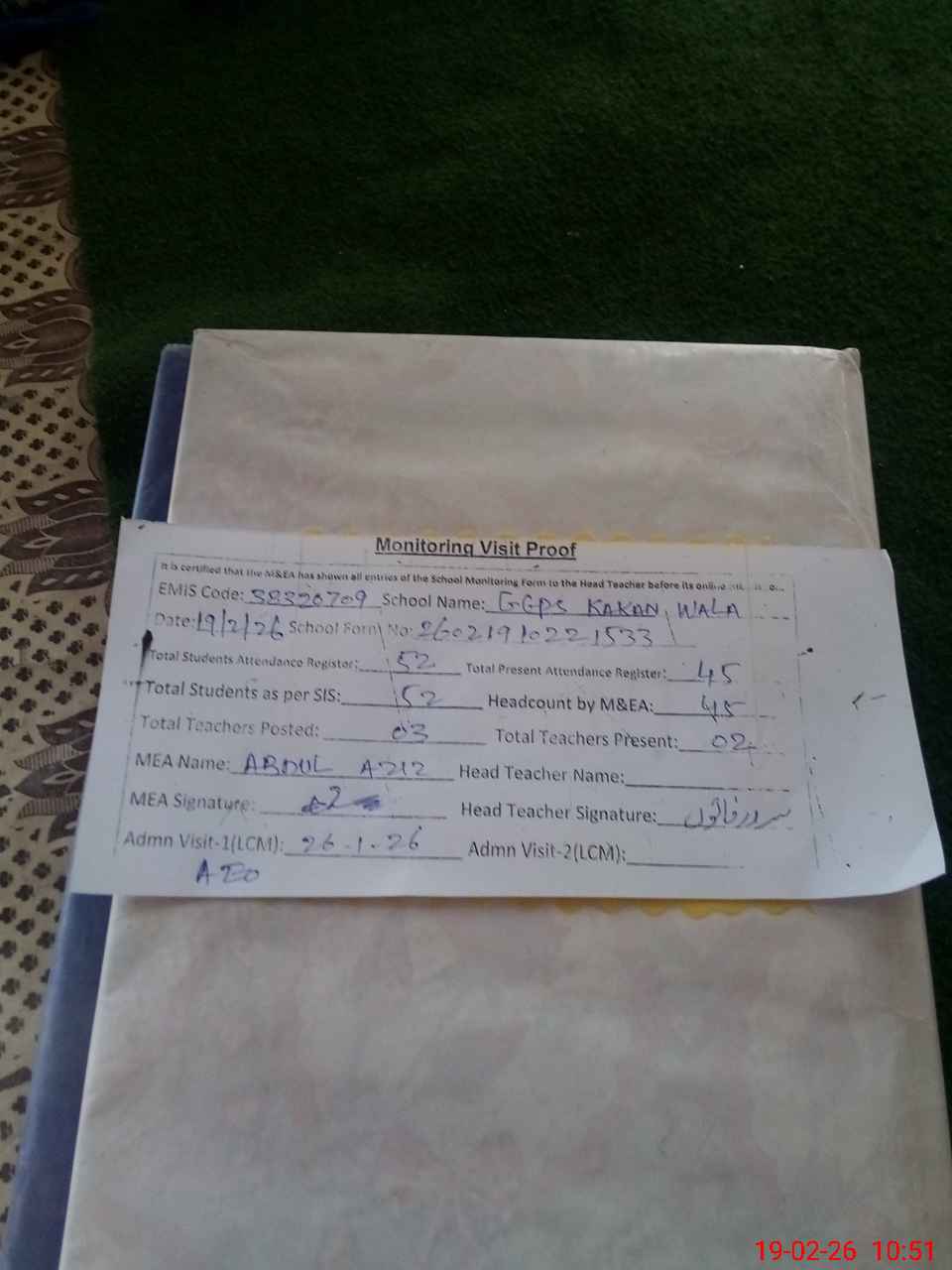 | Attendance Register | Head Teacher | MEA with School | Visit Proof |