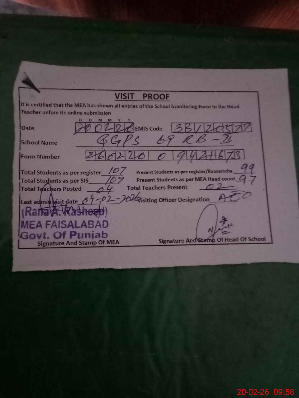| EMIS Code: 33120577 | Name of School: GGPS CHAK NO 69 RB-II | |||