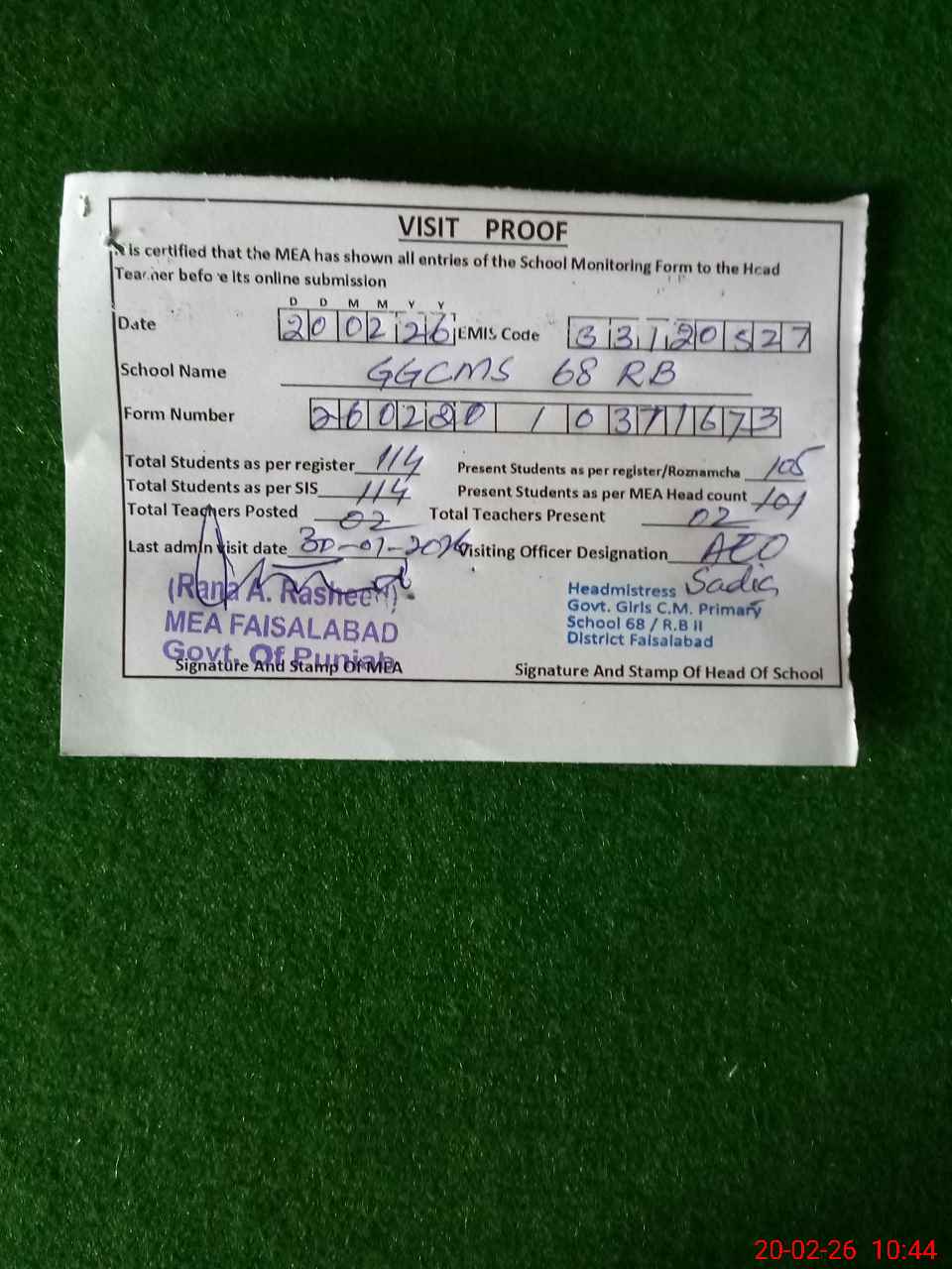 | Attendance Register | Head Teacher | MEA with School | Visit Proof |
