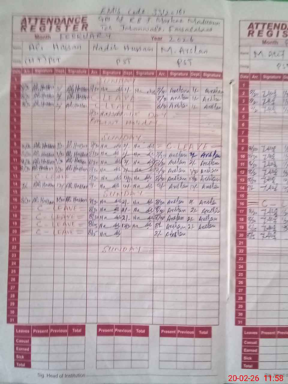 | CNIC | Full Name | Designation | R/C | Absence During Last Calender Month |