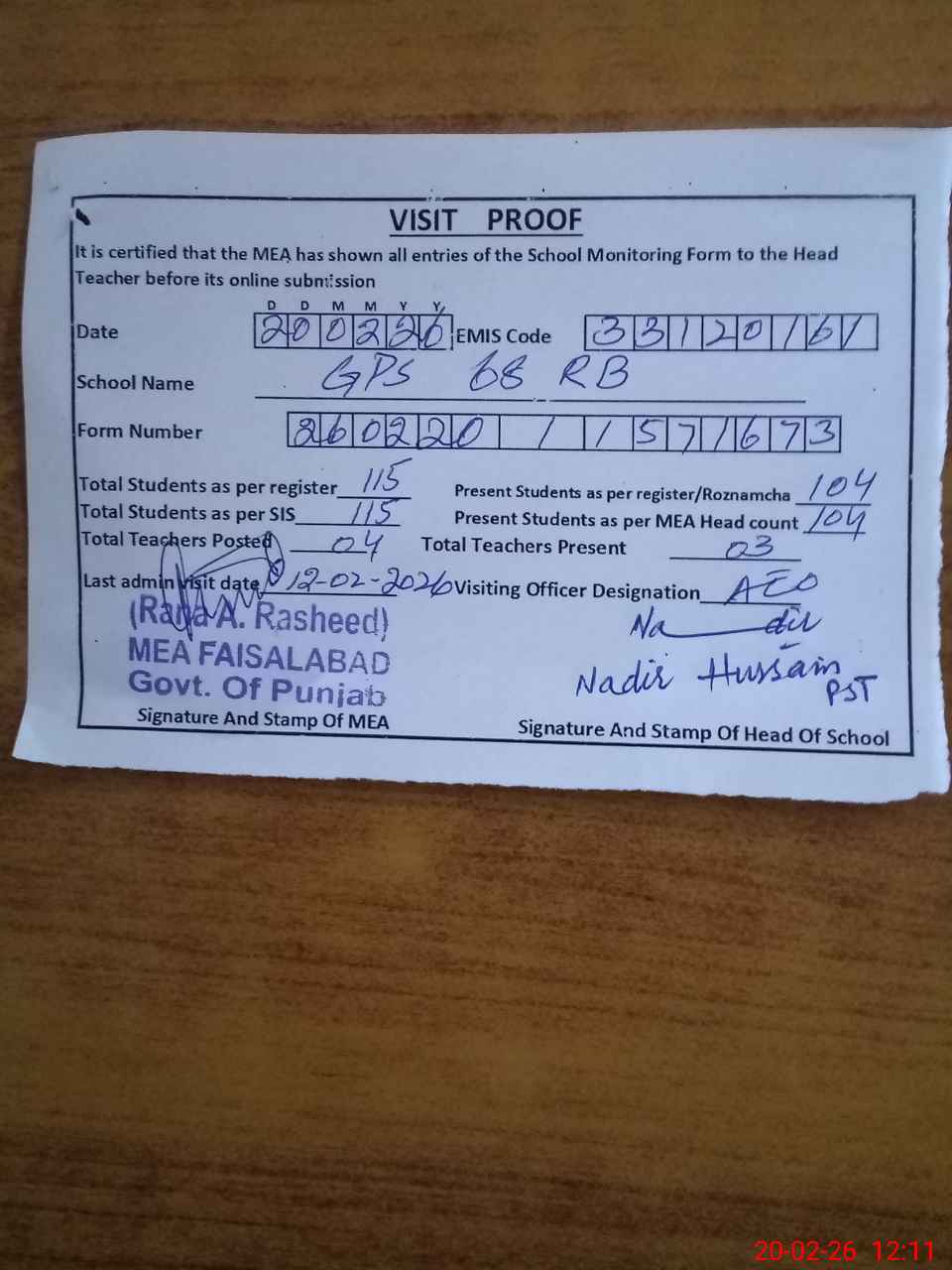| Attendance Register | Head Teacher | MEA with School | Visit Proof |