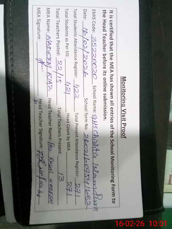 | EMIS Code: 35220020 | Name of School: GHS CHISHTIA ISLAM PURA LAHORE CITY | |||