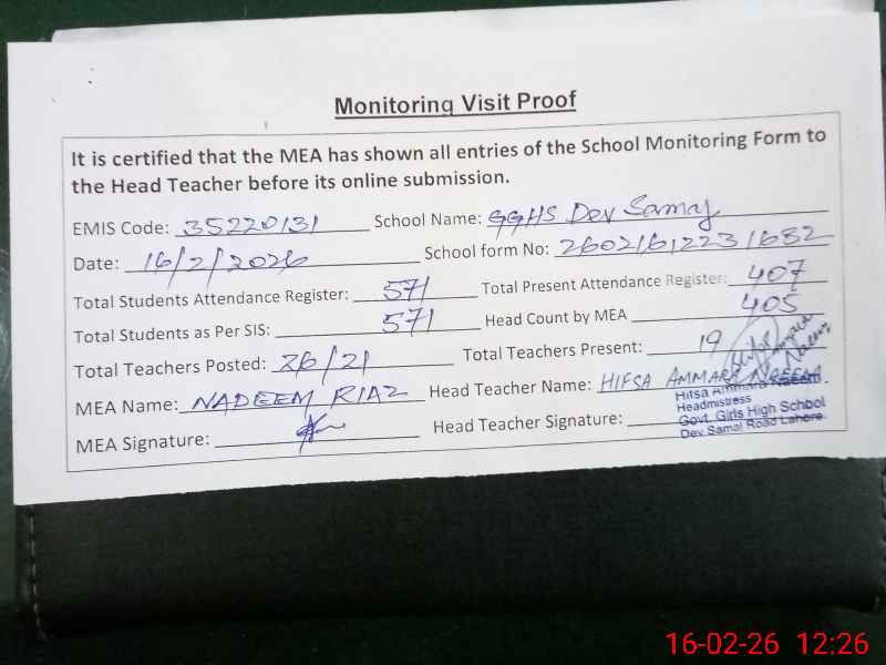 | EMIS Code: 35220131 | Name of School: GGHS DEV SAMAJ ROAD (Newly Upgraded) | |||