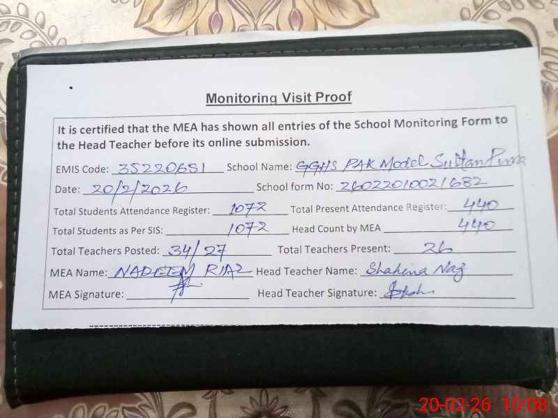 | EMIS Code: 35220651 | Name of School: GGHS PAK MODEL SULTAN PURA | |||