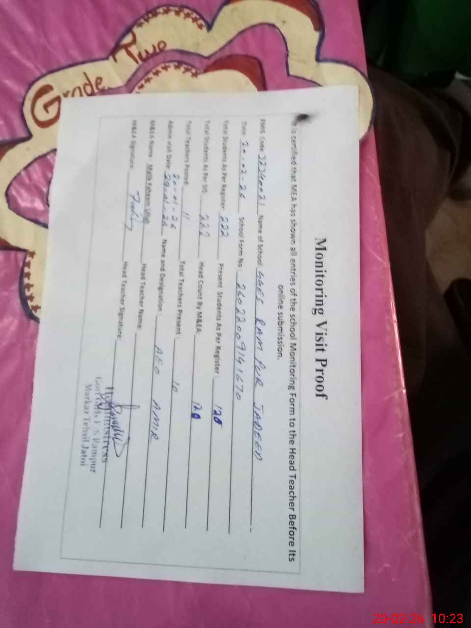 | Attendance Register | Head Teacher | MEA with School | Visit Proof |