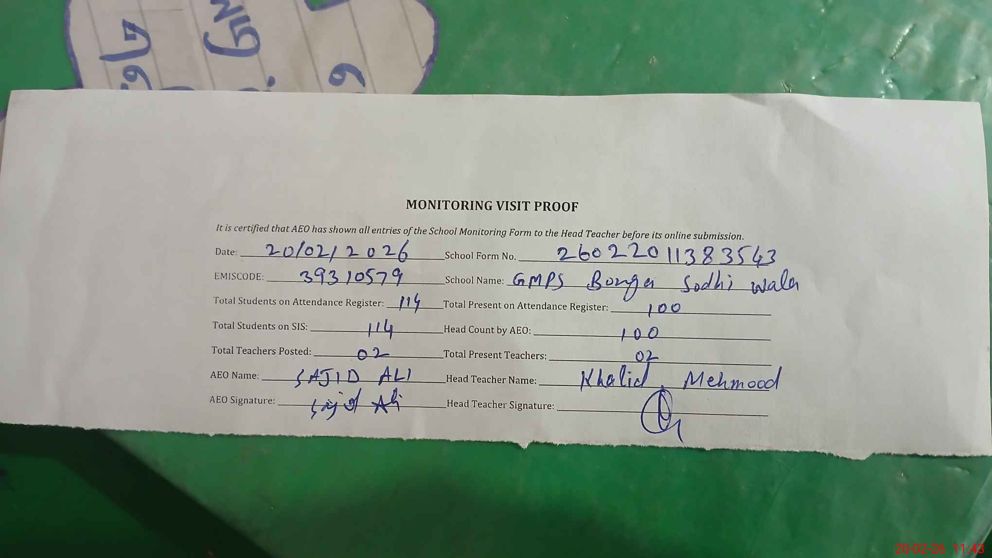 | Attendance Register | Head Teacher | MEA with School | Visit Proof |
