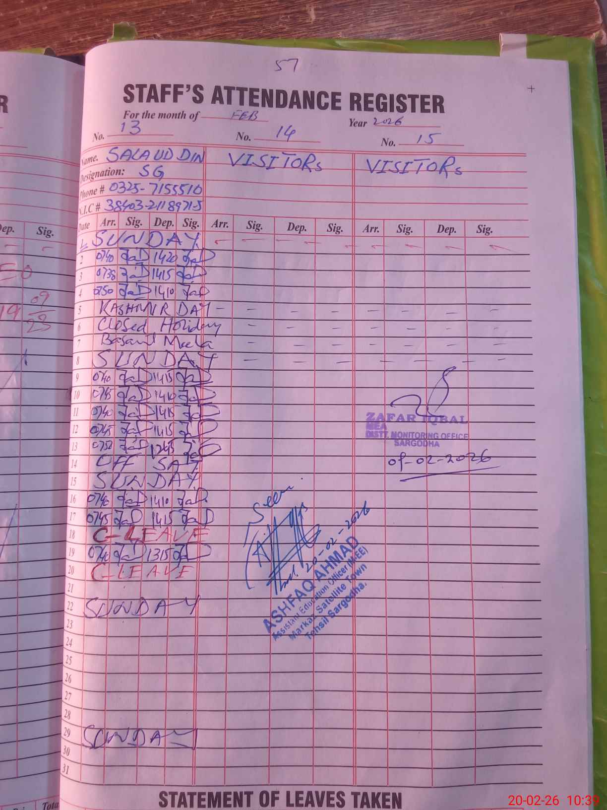 | CNIC | Full Name | Designation | R/C | Absence During Last Calender Month |