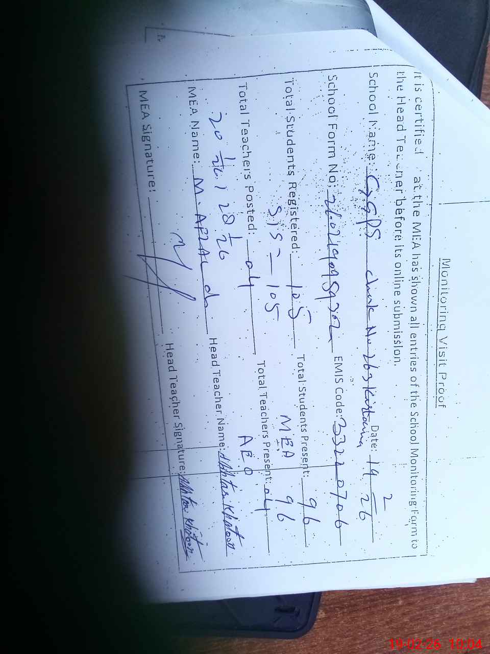 | Certified that this School was Inspected by the Undersigned MEA/DMO Today and the Information Stated Above is as Per Record. | |||||