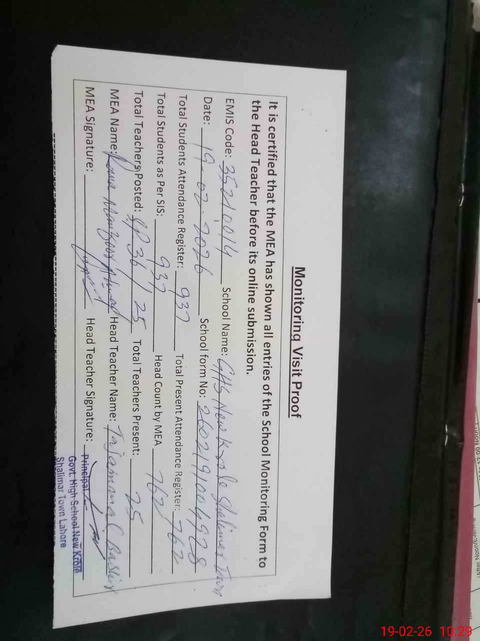 | Attendance Register | Head Teacher | MEA with School | Visit Proof |
