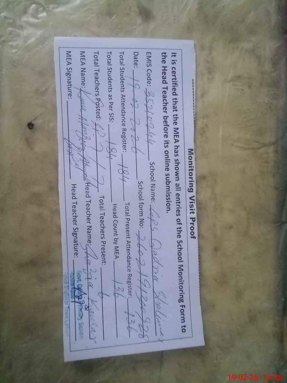 | Attendance Register | Head Teacher | MEA with School | Visit Proof |