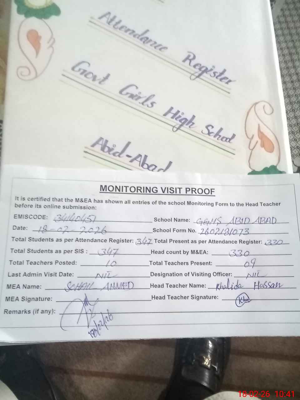 | Attendance Register | Head Teacher | MEA with School | Visit Proof |