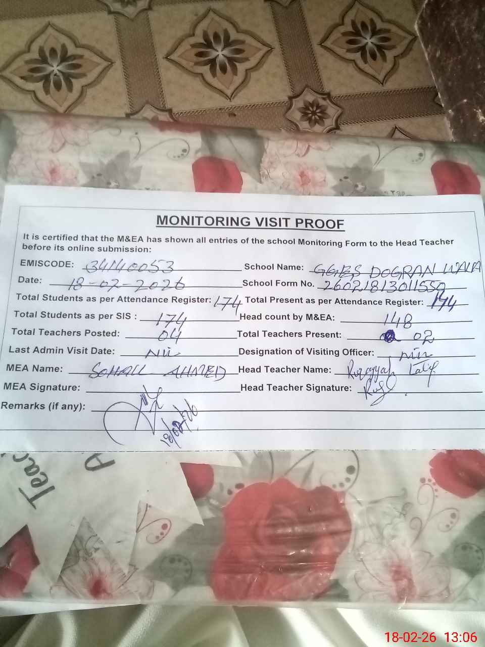 | Attendance Register | Head Teacher | MEA with School | Visit Proof |