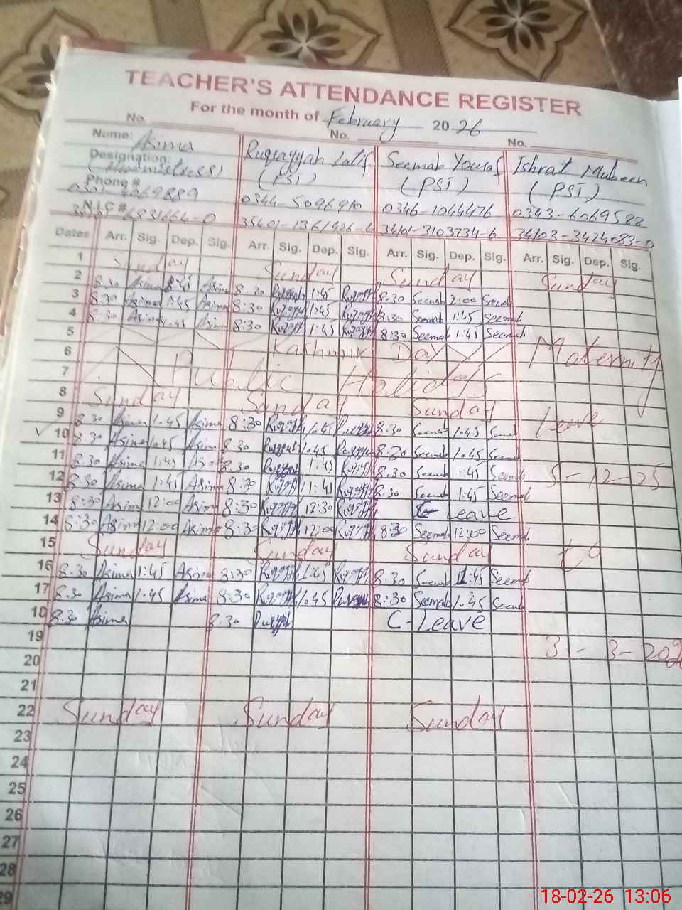 | CNIC | Full Name | Designation | R/C | Absence During Last Calender Month |