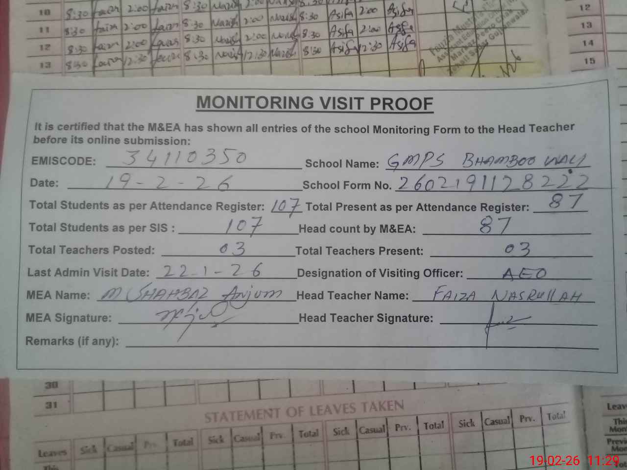 | Attendance Register | Head Teacher | MEA with School | Visit Proof |