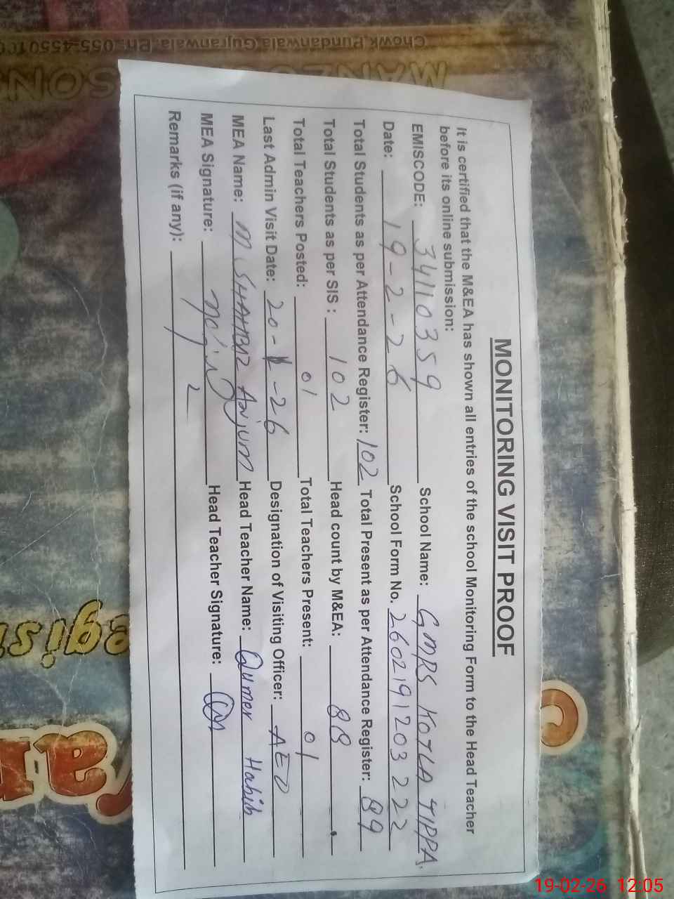 | Attendance Register | Head Teacher | MEA with School | Visit Proof |