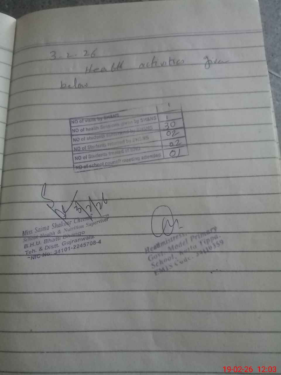 | School Visited by School Health & Nutrition Supervisor (No. of Visits) | 1 | Name1: | SAIMA SHAKOOR | Name2: | |