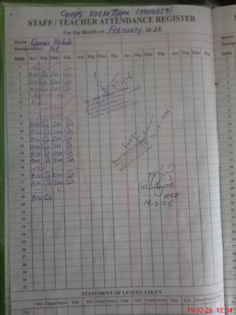 | Total no. of Classrooms: 5 No. of Classrooms Used for Teaching: 4 No. of Classrooms Storing Old Furniture, FTBs, etc: 0Comments if Any: AVERAGE CONDITION OF BUILDING AND SCHOOL NSB AND FTF RECORD WELL MAINTAINED IN REGISTER BUT NOT IN TAB COVID SOPS DISPLAYED AND PARTIALLY FOLLOWING BY STAFF AND STUDENTS TEMPERATURE GUN AVAILABLE CLEANLINESS OF SCHOOL IS CARRIED OUT BY STUDENTS ATTEN |